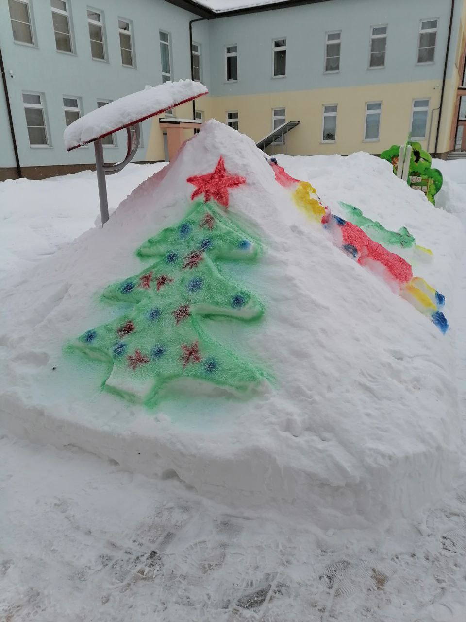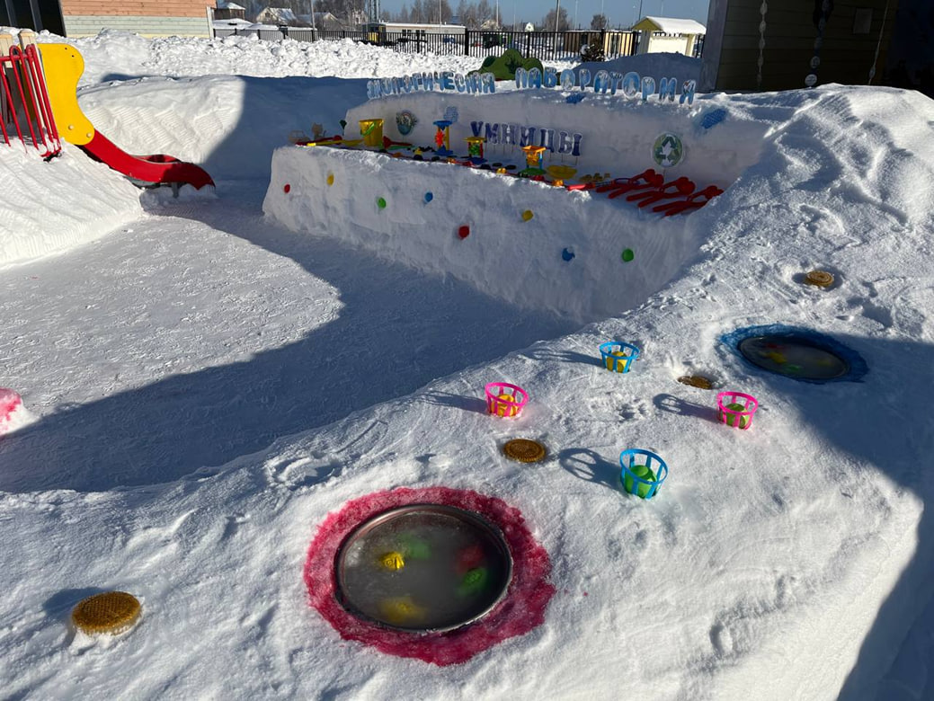 При входе в детский сад ребят и всех гостей встречает Умница. Кто увлечен наукой, любит экспериментировать, проводить опыты – для вас открыта зимняя лаборатория юных Эколят «Лаборатория Умницы». Вылепленные из снега друзья природы создали для детей настоящую исследовательскую лабораторию под открытым небом, в которой можно проводить разнообразную работу с дошкольниками в зависимости от их возрастных особенностей в процессе наблюдения за объектами живой и неживой природы, экспериментирования, выполнения физических упражнений и изобразительной деятельности. Что такое снег и лед? Почему снег белый? Свойства снега и льда. Почему форма снежинок меняется в зависимости от погоды? Откуда берется иней? Ведь все это можно узнать и изучить с помощью опытов и экспериментов. Ребята сделали искусственный водоем с рыбками, изготовили гирлянды из цветного льда с помощью формочек, создавали рисунки в технике тиснения на снегу.