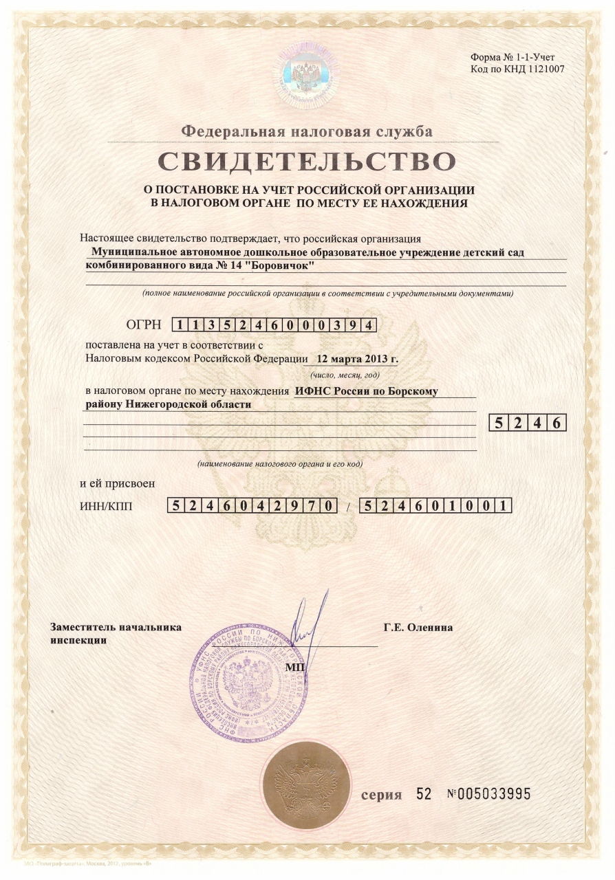 • Свидетельство о постановке на учет в налоговом органе по месту нахождения серия  52 № 005033995 от 12 марта 2013г.