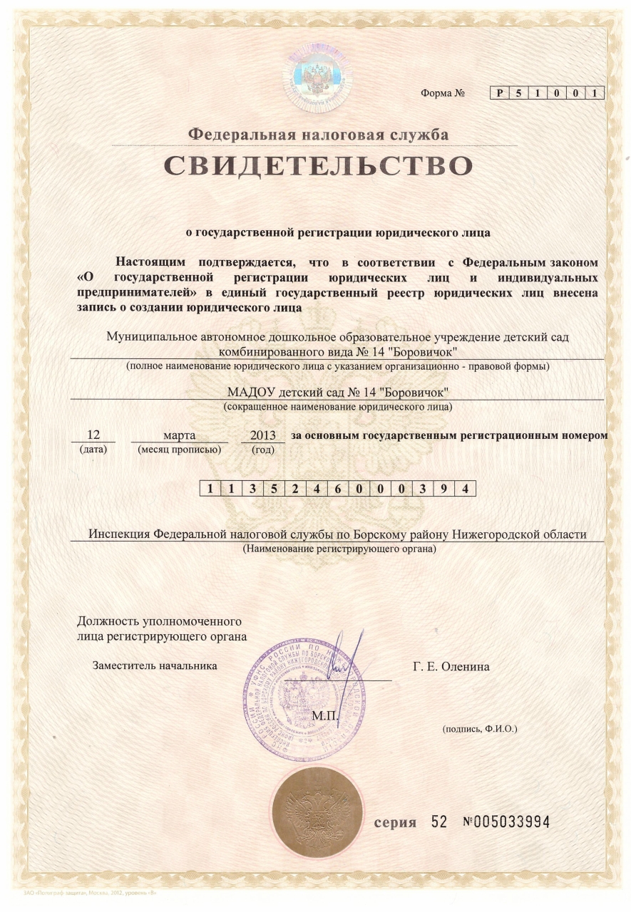 • Свидетельство о государственной регистрации юридического лица серия 52 № 005033994 от 12.03.2013г.